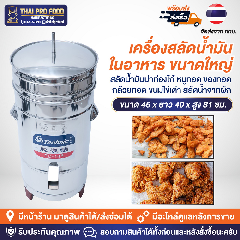 ✅ เก็บเงินปลายทางได้ / โอนเงินได้ 💡 การทำงานของตัวเครื่องเป็นลักษณะการเหวี่ยงน้ำมันหรือน้ำออก สามารถนำไปใช้งานกับวัตถุดิบ ดังนี้ ปาท่องโก๋ หมูทอด ของทอด กล้วยทอด ขนมไข่เต่า สลัดน้ำจากผัก เป็นต้น 💡 ขั้นตอนการใช้งานง่ายๆ 1.ใส่ปาท่องโก๋ กล้วยทอด หมูกระจก หรือของทอดอื่นๆ ในผ้ากรอง 2.นำผ้ากรองเข้าในเครื่อง จากนั้นกดเปิดสวิตช์ 3.ตัวเครื่องจะทำการสลัดน้ำมันออกจากอาหาร คุณสมบัติสินค้า